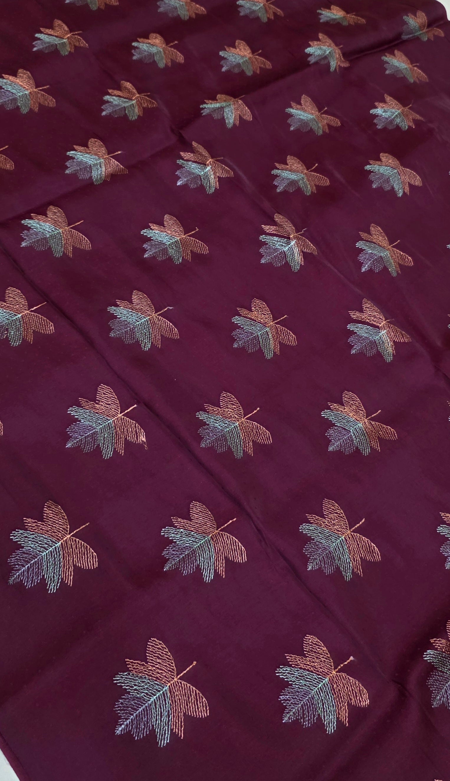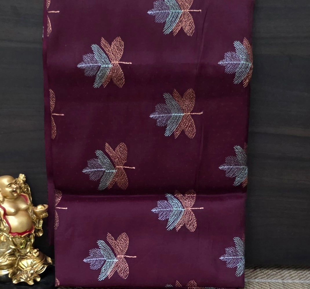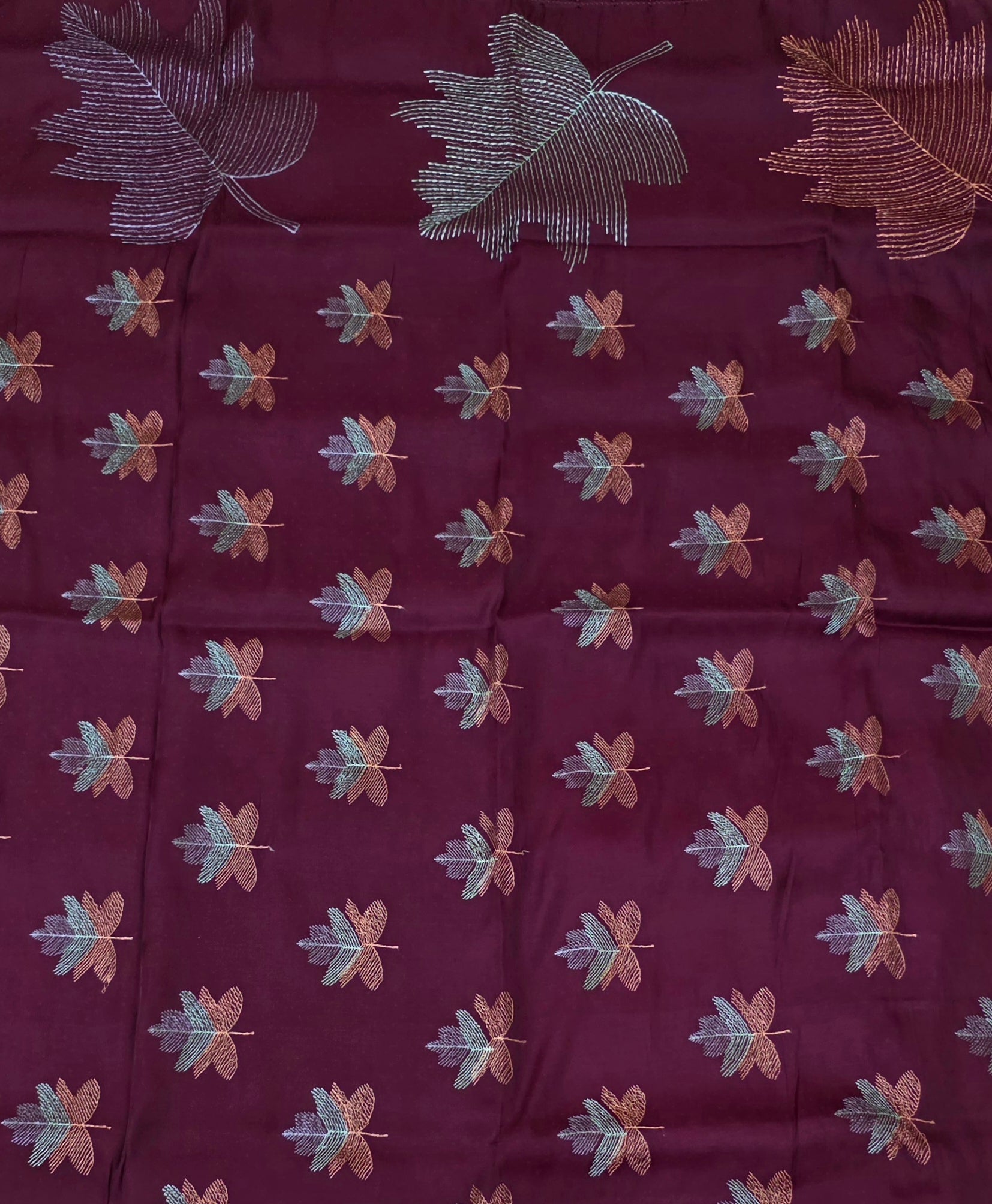 About Saree - Butter silk is a lightweight, ultra-soft fabric that drapes beautifully and feels smooth against the skin. The saree features elegant leaf motifs . The subtle dotted texture in the background adds depth, while the overall design maintains a minimal and graceful aesthetic. It comes with a running blouse with zari woven buttas enhancing the overall look.