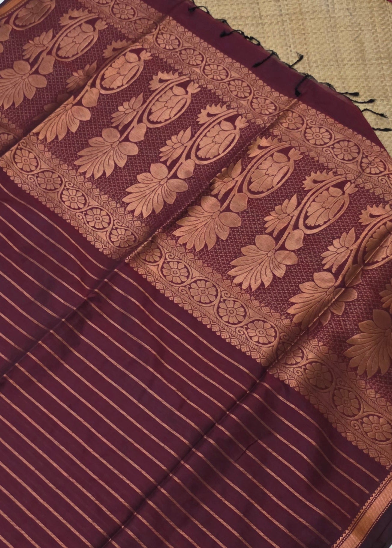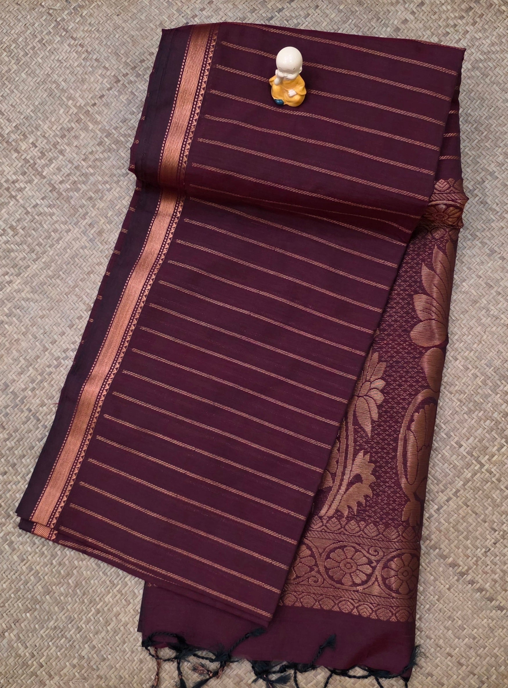 About Saree - This soft cotton saree features fine zari lines running across the body, lending it a subtle, elegant texture. The pallu is richly woven with traditional floral motifs and intricate patterns, complemented by tassels at the edge. It comes with a plain running blouse with border.